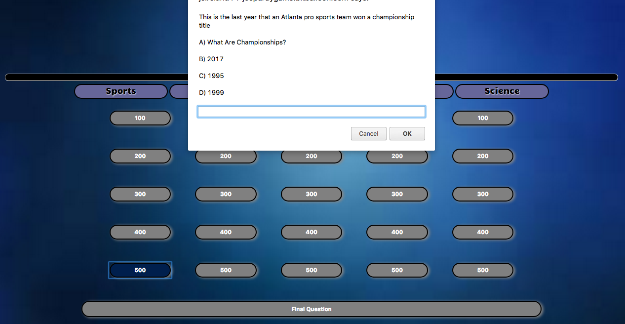 For my first project I created a Jeopardy game using HTML, CSS, and JavaScript. This game follows classic Jeopardy rules