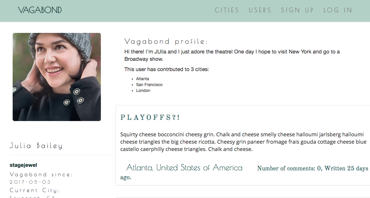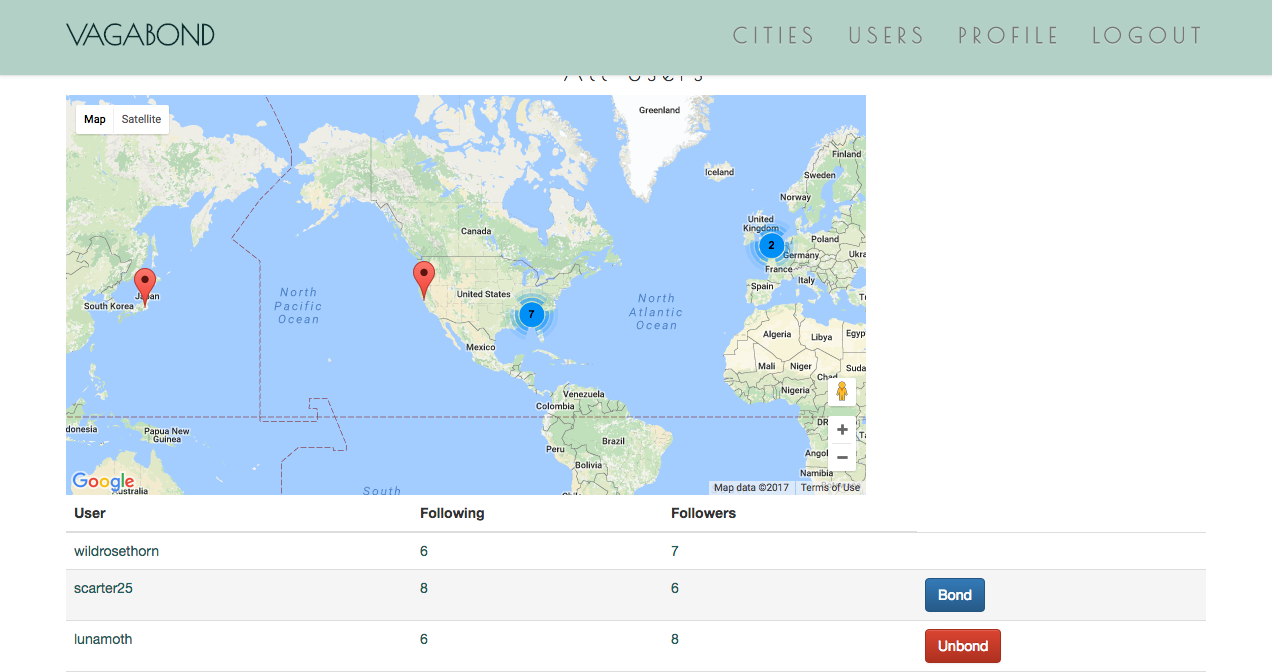 For this project I worked in a group of 4 to create a Ruby on Rails application where users can write reviews, post topics and tips for specific cities. Users can comment on other user's posts and bond(follow) with other users so that their posts will show on the user's home feed. In the bond view, users can see on a map where other users are currently living.